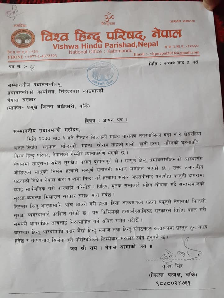 भाद्र ५, काठमाण्डौ। रौतहट जिल्ला माधवनारायण नगरपालिका वडा नं.२ खेसरहीया स्थित श्री हनुमान मन्दिरका पुजारी श्रीराम साहको गोली हानि हत्या गरिएको घटनाको विश्व हिन्दू परिषद नेपालले घोर भत्सर्ना गर्दै देशै भरिका प्रमुख जिल्ला अधिकारीहरुलाई ज्ञापनपत्र बुझाएका छन्।